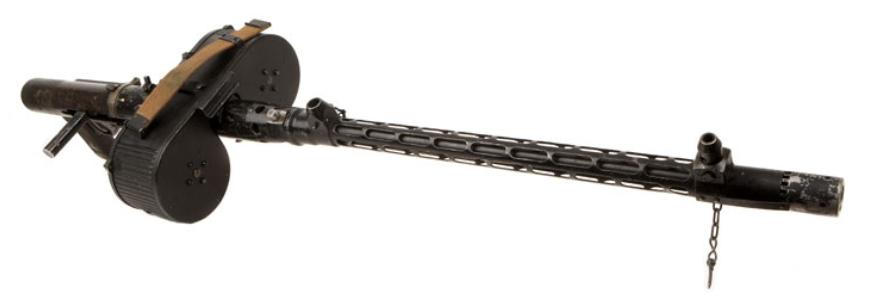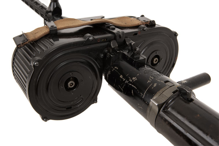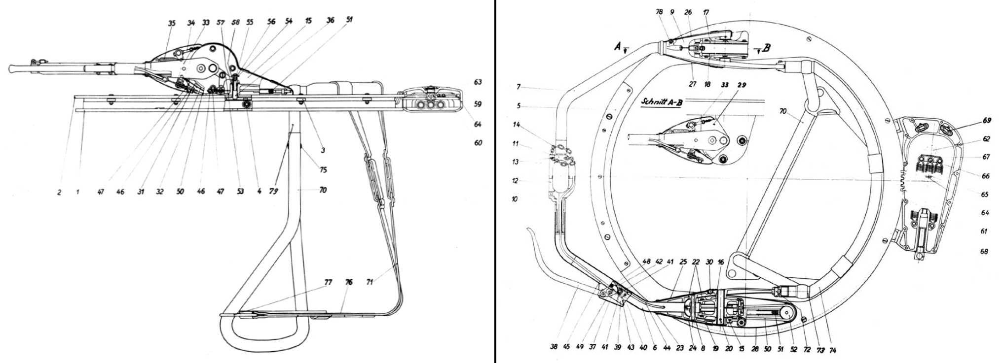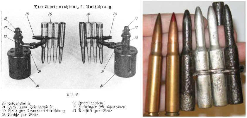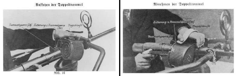 Apostar la MG 15 (7) en el almacenamiento – MG (8) en el soporte de la corona giratoria D 52 (5). A continuación, colocar la bolsa de vainas vacías y el dispositivo de mira en el arma. El arma de ser fijada entonces en el botón de amarre de la corona giratoria y situar la corona giratoria con la MG 15 en posición de funcionamiento.