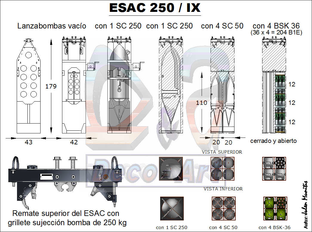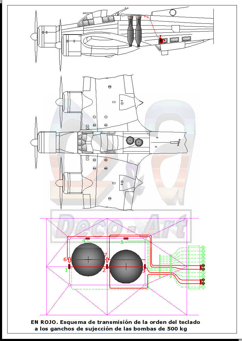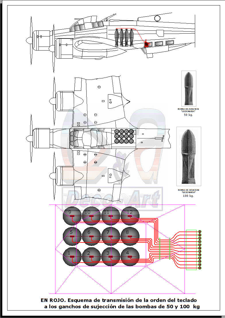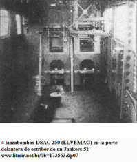 El potencial militar, unido a las excelentes cualidades de vuelo de este aparato, no paso desapercibido para la todavía clandestina Luftwaffe y ello condujo a la fabricación de una versión o mejor diríamos a una adaptación de la aeronave civil a funciones de bombardeo, naciendo el Ju 52/3mge, la primera versión militar y posteriormente un mejorado Ju 52/2mg3e. Esta adaptación como bombardero pesado apenas afectaba la fisonomía original del aparato y podía ser fabricado con la mayor rapidez sin modificar la cadena de montaje existente, aspecto este muy importante para asegurar uno intenso suministro de aparatos. En la versión mejorada podía transportar una carga interna máxima de seis bombas de 250 kg ó 24 de 50 kg ó 90 de 10 kg ó 864 incendiarias de 1 kg y para ello se diseñaron por la empresa Siemens Apparate und Maschinen G.m.b.H. de Berlín, unos lanzabombas verticales de “quita y pon” denominados DESAC 250 que luego se emplearon también en otros modelos de aeronaves readaptados para usos militares, como el Heinkel He 111. De él hablaremos en otro trabajo monográfico. Como armamento defensivo se le acoplaron dos ametralladoras MG 15 de 7,92 mm. una en posición dorsal hacia la cola del aparato dentro de un anillo giratorio, y otra en un puesto ventral escamoteable que se recibió varios nombres o apodos: góndola, puchero, orinal, etc. Yo utilizaré, en adelante, en una personal aunque inútil venganza, el termino de “orinal” para referirme a él. También desarrollaremos la descripción detallada de estos artilugios en otro capítulo más adelante.