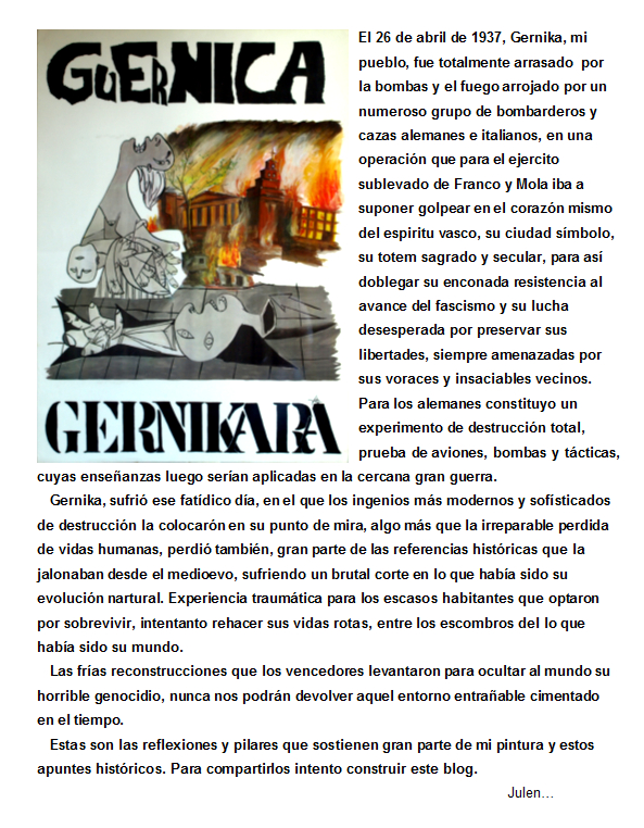 Los gerniqueses nunca lo veremos de otra forma que como aquel que, en oleadas, que parecían eternas, dejó un largo rosario de muerte y destrucción en nuestro pacífico pueblo. Sin embargo las máquinas no tienen alma y aquellos que las manejan y las utilizan para asesinar de forma harto cruel y despiadada a la población civil, parece que también carecían de ella.